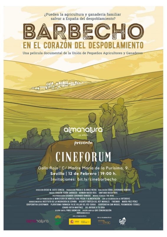 Tenemos la suerte de contar con dos grandes colaboraciones, por un lado con la UPA (Unión de Pequeños Agricultores) quienes han producido su segunda película documental Barbecho: “En el corazón del despoblamiento” y han cedido los derechos de emisión; y Gallo Rojo Factoría de creación que abastecerá del espacio en el que se proyectará el documental.