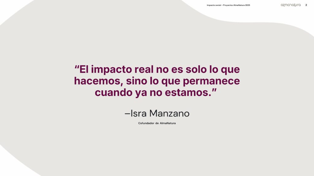 En AlmaNatura hemos intentado acercarnos a la medición desde otro lugar. No como una exigencia externa, sino como una forma de cuidar lo que hacemos y de mantener coherencia con el propósito que nos trajo hasta aquí: generar oportunidades reales en el medio rural y contribuir a que las personas puedan desarrollar su vida en los pueblos con dignidad, opciones y futuro.